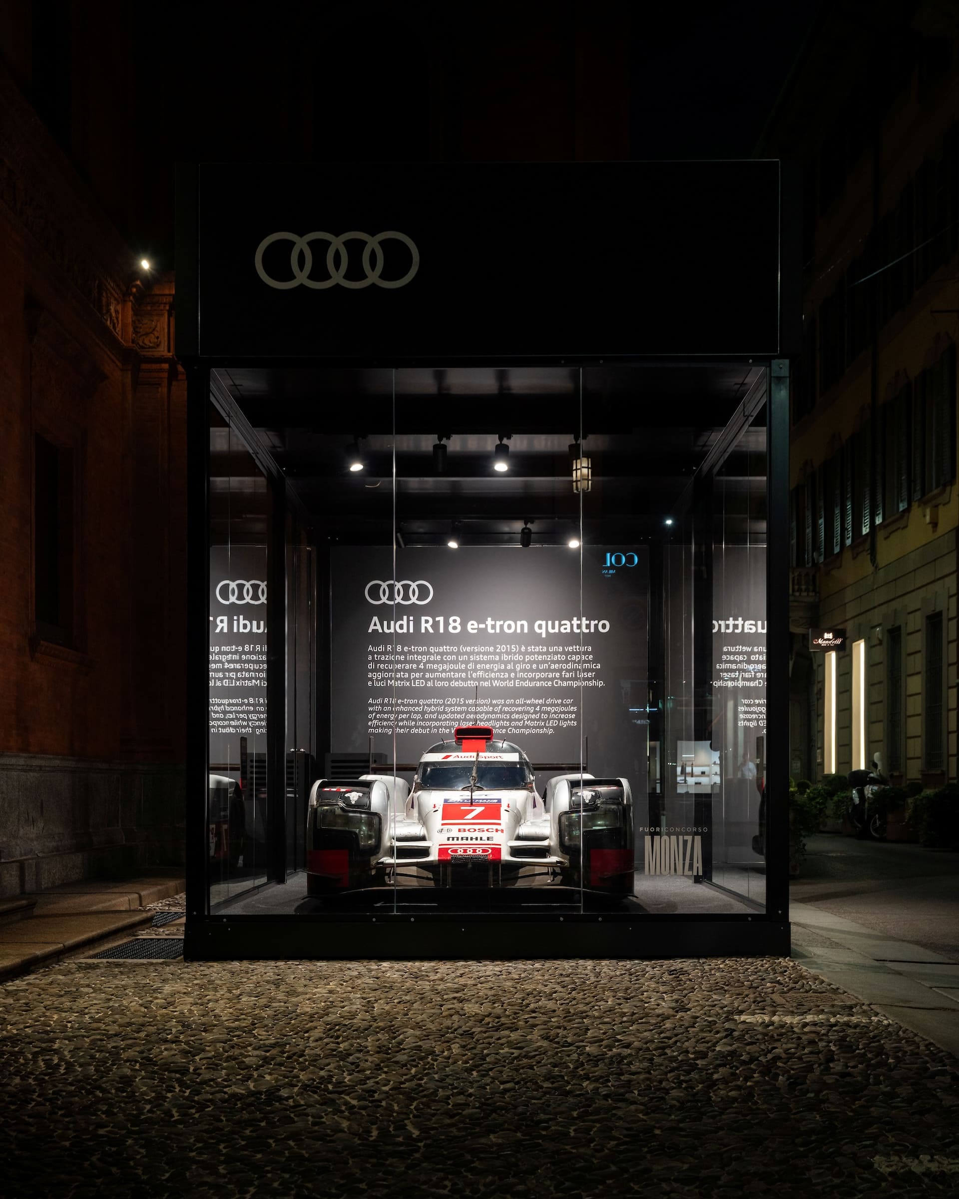 In occasione della prima edizione di FuoriConcorso – Monza, manifestazione ideata da Guglielmo Miani (presidente di Larusmiani e del MonteNapoleone District) che richiama appassionati e collezionisti di auto d’epoca e instant classic, Audi ha esposto la sua iconica vettura da competizione Audi R18 e-tron quattro. La monoposto, parcheggiata all’esterno dello storico palazzo del Museo Bagatti Valsecchi, a corredo di una selezione di vetture di Formula 1 che hanno fatto la storia del Gran Premio d’Italia a Monza.