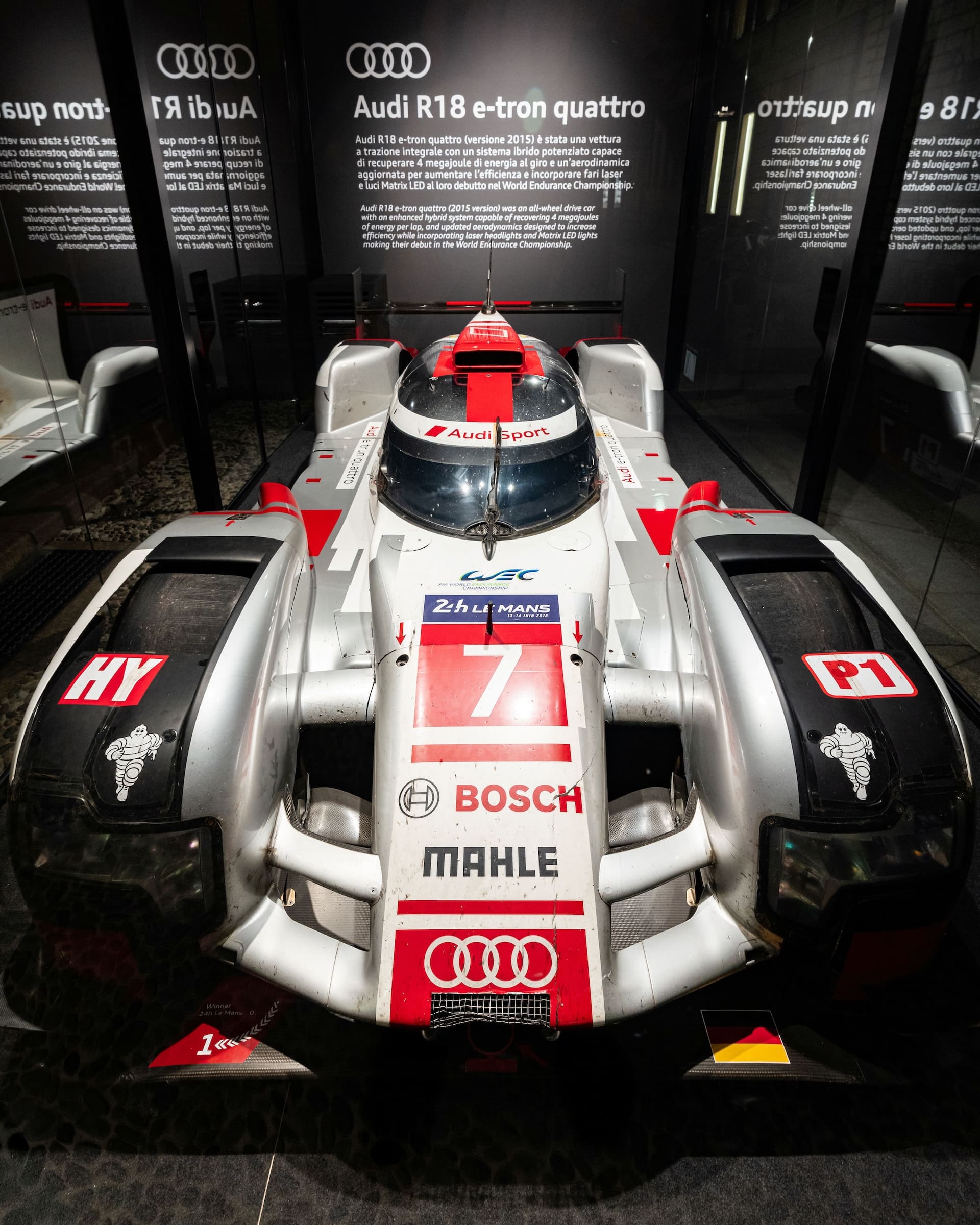 La presenza dell’Audi R18 e-tron quattro, guidata nella sua epoca d’oro dall’equipaggio Marcel Fässler, André Lotterer e Benoît Tréluyer, sottolinea il ruolo centrale del motorsport nella strategia del brand. Competitrice nel Fia World Endurance Championship nel 2015, la R18 ha incarnato l’evoluzione continua delle tecnologie ibride da competizione, raccogliendo successi nel Campionato Mondiale e alla 24 Ore di Le Mans.
